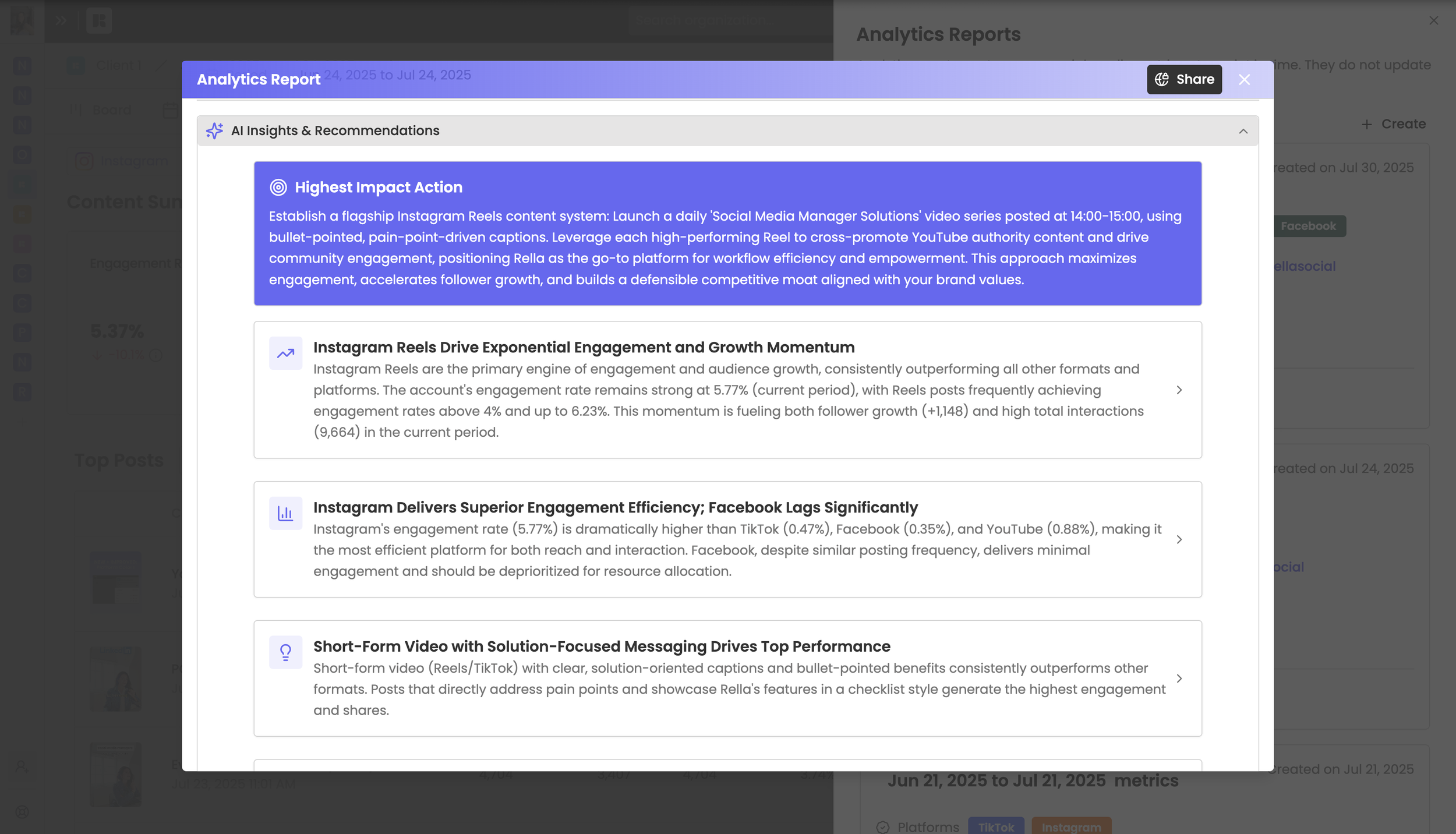 But it’s not just about viewing the data—Rella goes further by offering the ability to generate analytic reports. Unlike other tools that require upgraded subscriptions and logins to access reports, Rella makes it incredibly easy to share social media analytics. With just one click, you can generate a shareable analytics report, allowing clients to view the data through a simple link without creating an account! Generating analytics reports with Rella make it easier than ever to keep clients in the loop and showcase the measurable impact of your social media efforts.