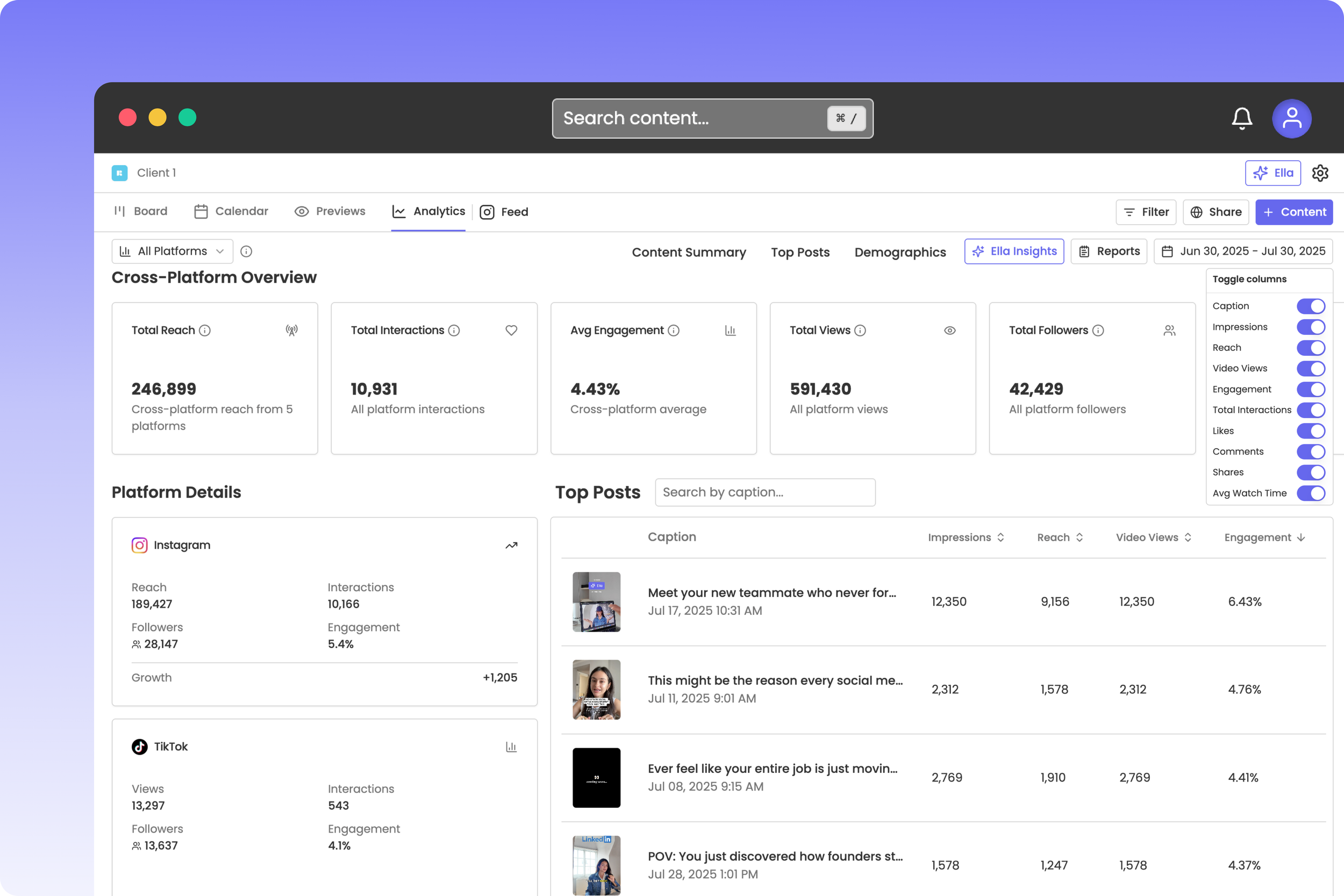 In the fast-paced world of social media management, data is everything. Having a content management tool that integrates detailed social media analytics can make all the difference. Tracking account and post performance allows your team to communicate the impact of your social media strategy with clients.