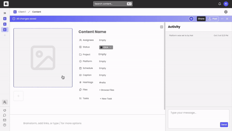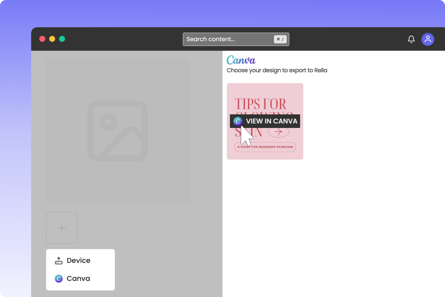 It’s important to choose a content management tool that streamlines your process. With Rella’s Canva integration, you can link your Canva account and instantly export graphics into Rella during any moment in the planning process to eliminate the extra steps of downloading and uploading media. This not only saves time but also centralizes your design assets alongside your content planning, keeping everything organized and accessible in one place. By connecting your Canva and Rella accounts, you enhance collaboration, and simplify your workflow—all without leaving the platform.