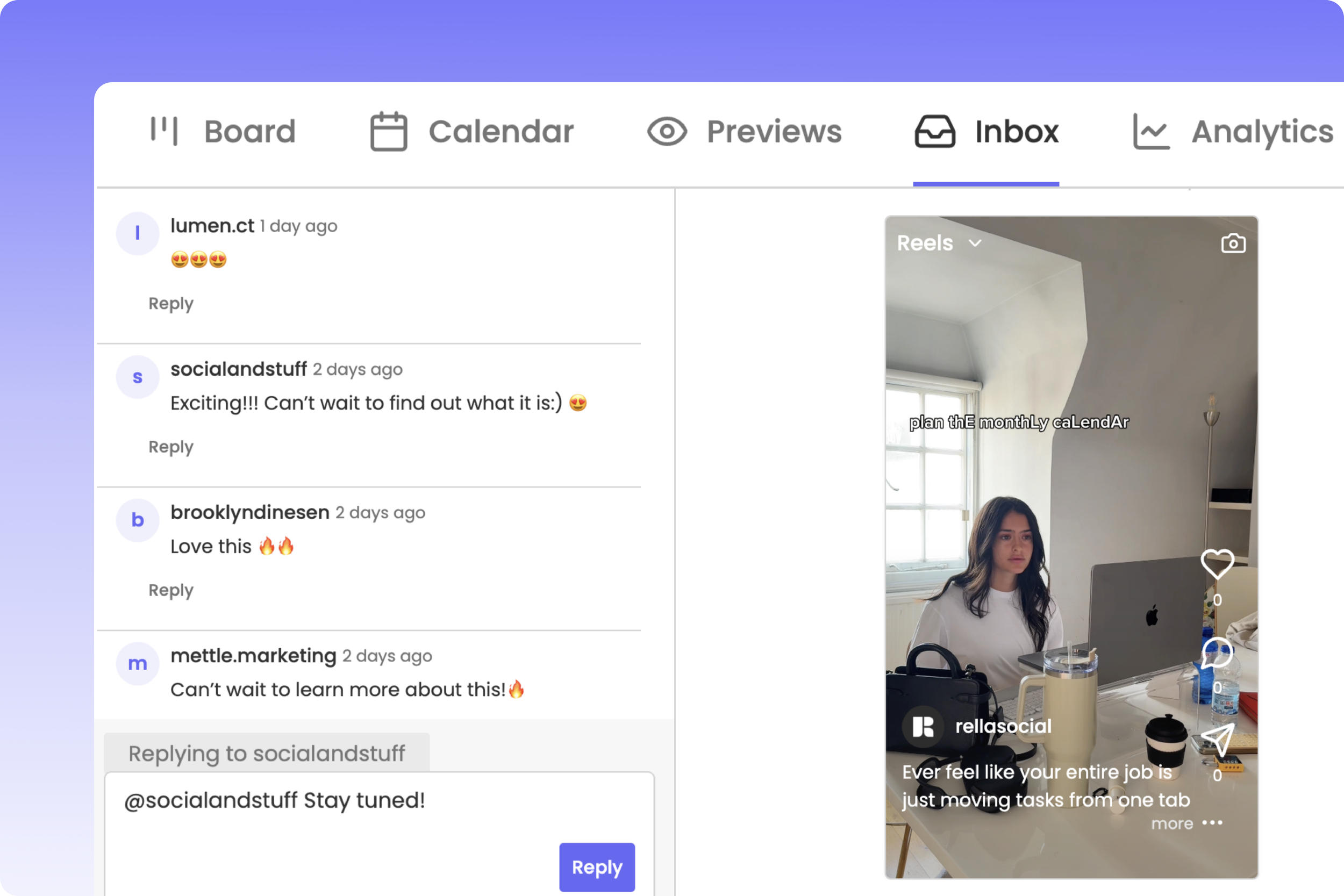 Now available for Rella Premium and Premium Plus users, Social Inboxing lets you respond to comments and DMs directly inside Rella, without ever opening Instagram.