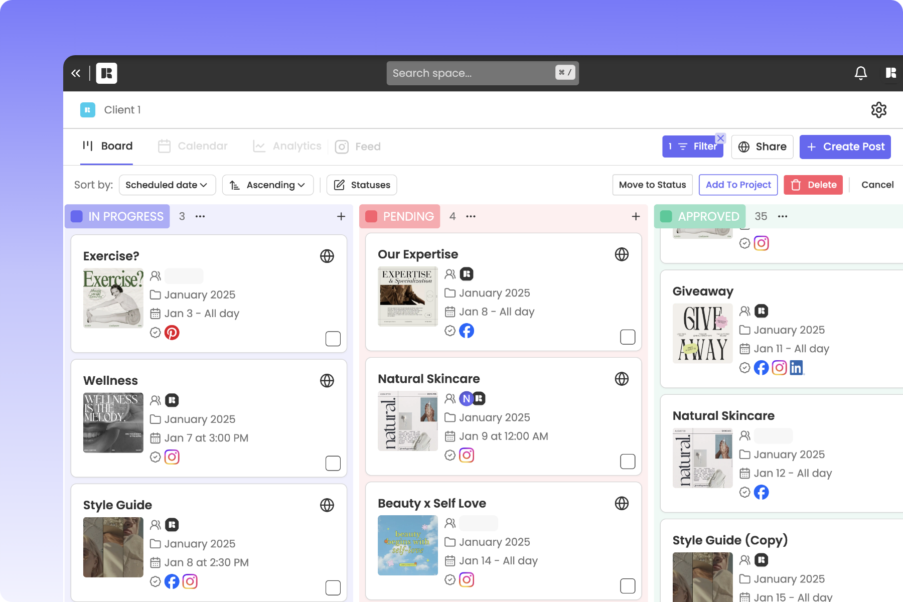 It's one thing to plan out a piece of content, but keeping track of a whole batch once it's in motion? That's where Rella shines. On Rella you can preview post details and monitor statuses in addition to viewing your content calendar. Rella’s board view gives you a comprehensive overview so deadlines are met, quality is maintained, and your Social Spaces can run smoothly!