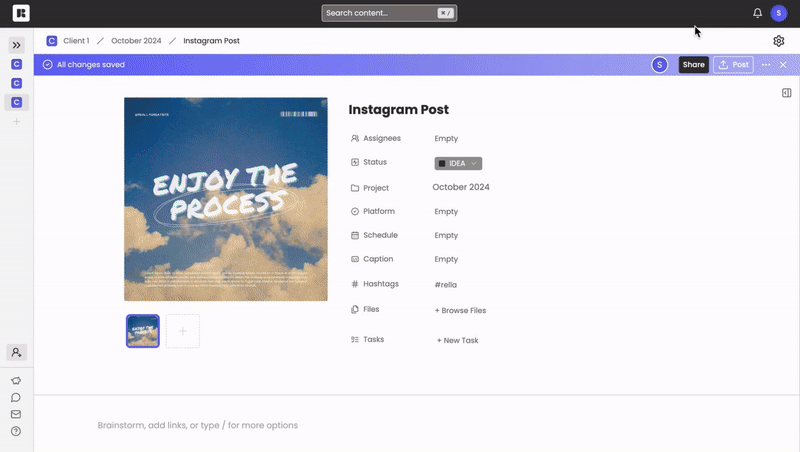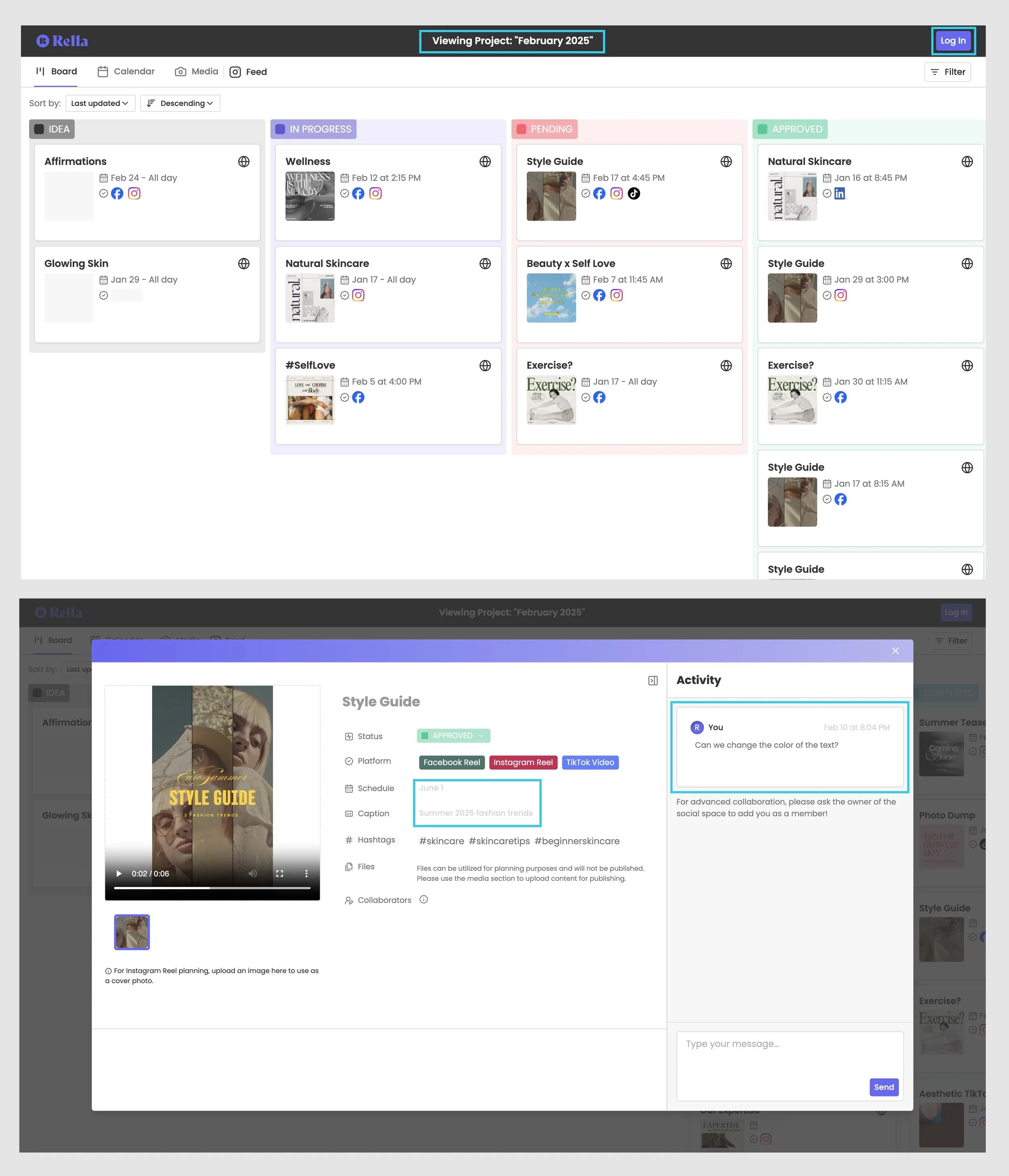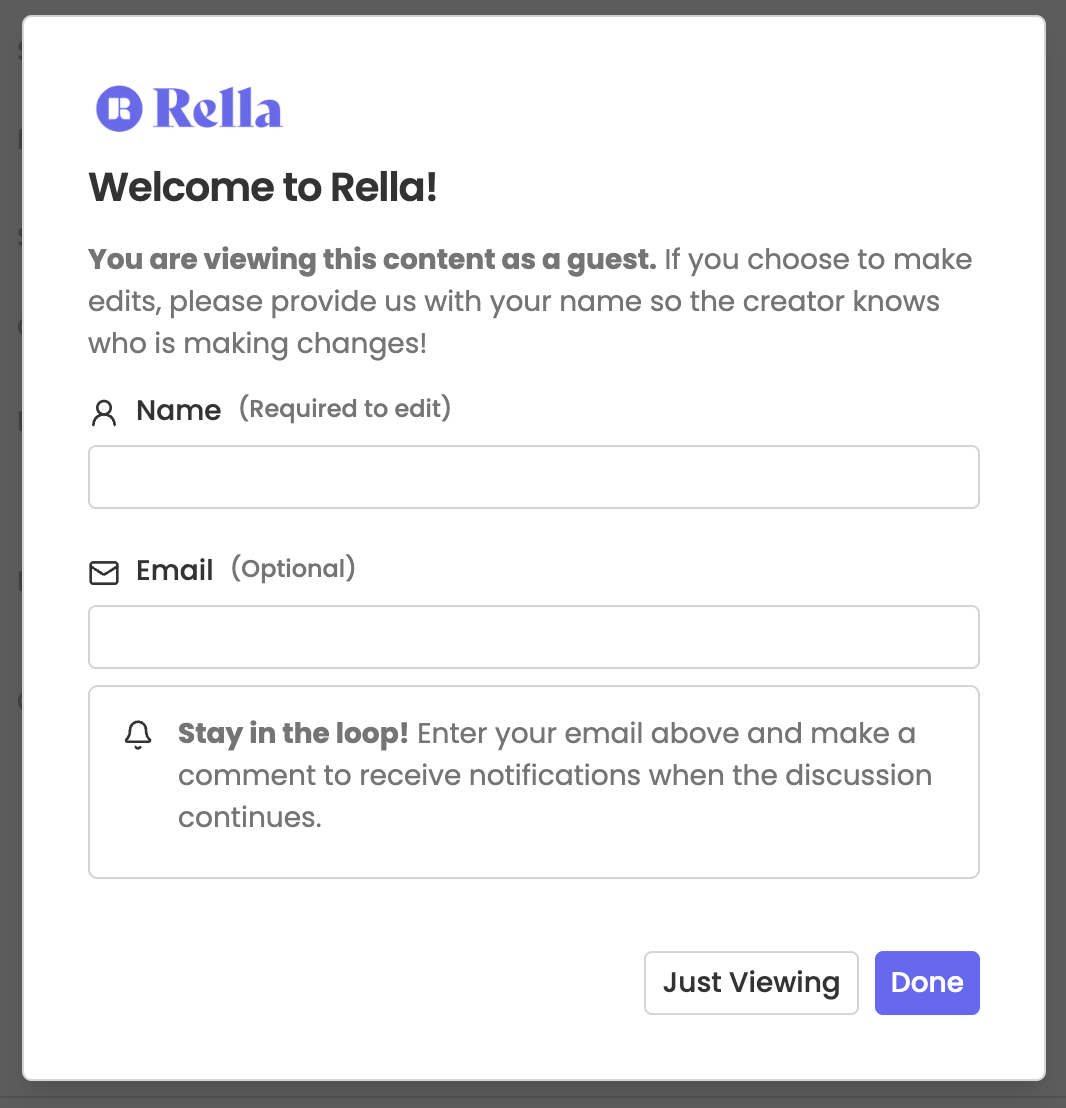 Clients or collaborators do not need to create a Rella account to view content, update statuses, and leave comments. If you’re looking to grant access to edit content you’ll need to invite a member to your Social Space.