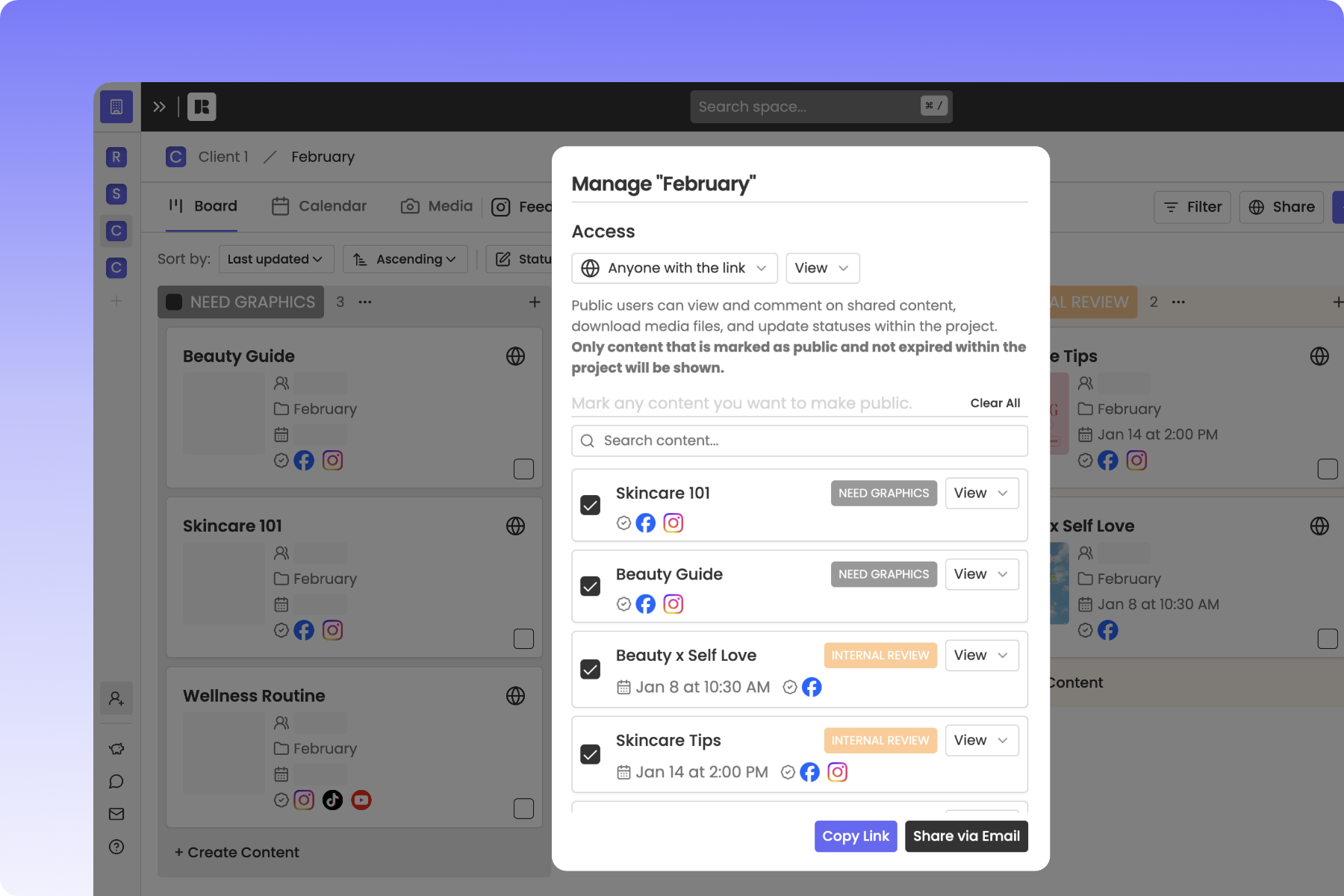 Go to a post and click “Share” in the top right. Under “Access” select “Anyone with the link” can “View.” If you’d like to set a deadline to receive feedback add a date under “Link Expiration.” Copy or email the link. Anyone accessing the link will be to view the content, update statuses, and leave comments.